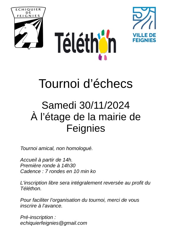 Le tournoi du Téléthon 2025 aura lieu le samedi 6/12/2025 de 14h30 à 18h au salon d'honneur de la mairie de Feignies.