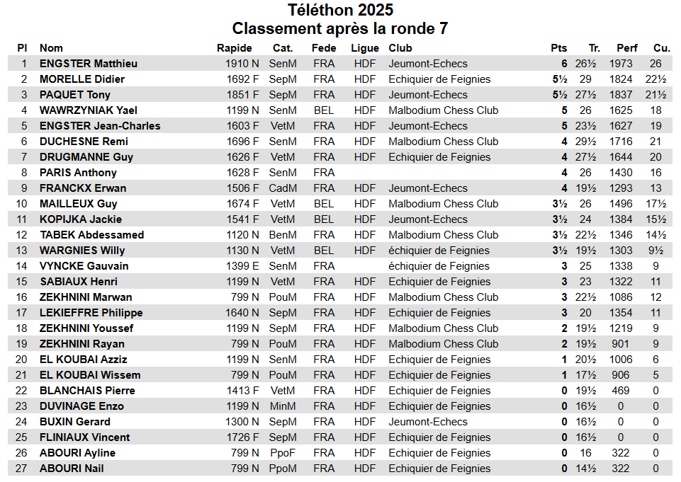 Le tournoi du Téléthon 2025 a eu lieu le samedi 6/12/2025 au salon d'honneur de la mairie de Feignies.